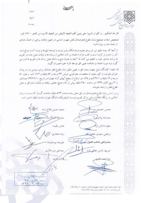 لذا امضاء کننده گان ذیل جهت رصد افق و تعیین دقیق زمان طلوع فجر صادق، برای سومین بار در بیابان اطرف قم (بعد از گوه سفید) با مختصات جغرافیایی غرض ۳۴ درجه و ۵۶ دقیقه و ۱۸/۳ ثانیه و طول ۵۱ درجه و ۱۶ دقیقه و ۴۷/۱ ثانیه و ۸۲۵ متر ارتفاع از سطح آبهای آزاد جهان، و در تاریخ ۱۳۹۶/۹/۱۰ مصادف با ۱۲ ربیعالاول ۱۴۳۹ در ساعت ۴:۵۰ دقیقه پیش از اذان صبح حضور یافتند و با دقت تمام افق و محل طلوع فجر را رصد نمود.